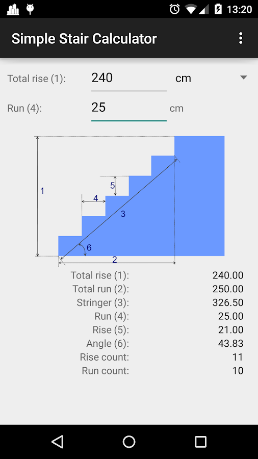 Stairs Calculator. Provides a step by step display and a print out option showing the finished stringer with cut dimensions and a materials list. Layout and cut stair stringers easily - Prefect Stairs.